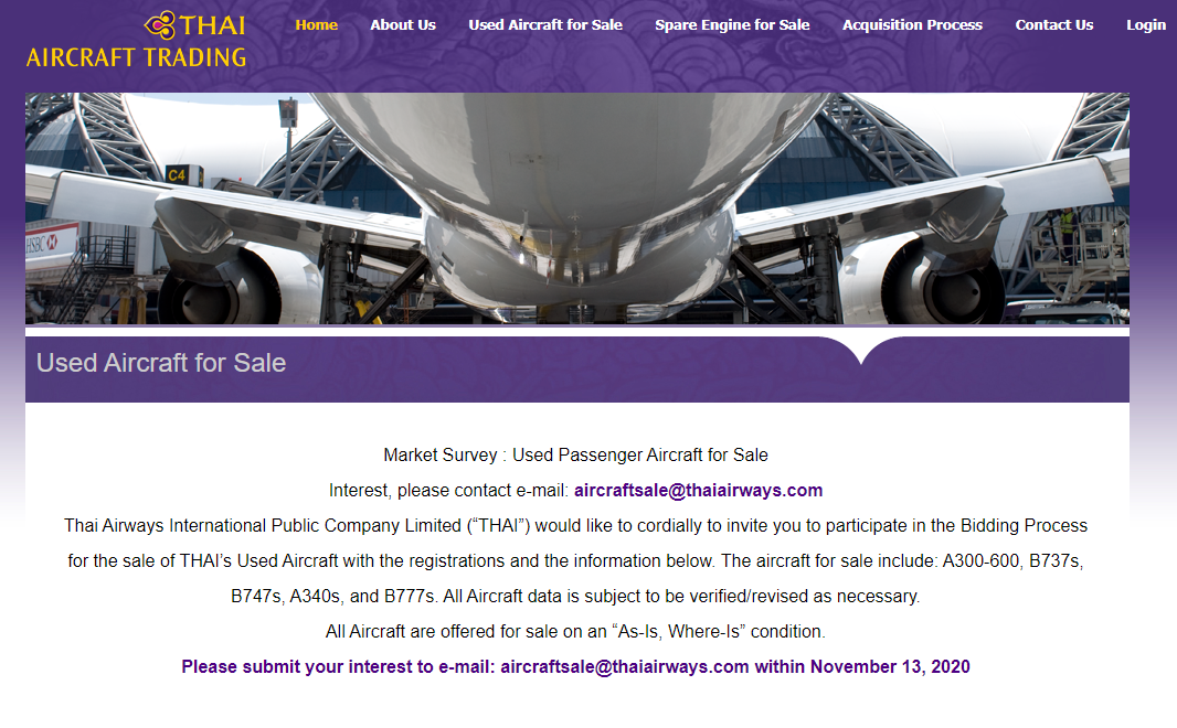 วันที่ 5 พฤศจิกายน 2563 ผู้สื่อข่างรายงานว่า เว็บไซต์ http://www.thaiaircrafttrading.com/ บริษัท การบินไทย จำกัด (มหาชน) ประกาศเชิญชวนผู้ที่สนอากาศยานมือ 2 เข้าร่วมกระบวนการเสนอราคาสำหรับการขายอากาศยานของการบินไทย โดยสามารถลงทะเบียนและข้อมูลได้ที่อีเมล์ airplanesale@thaiairways.com
