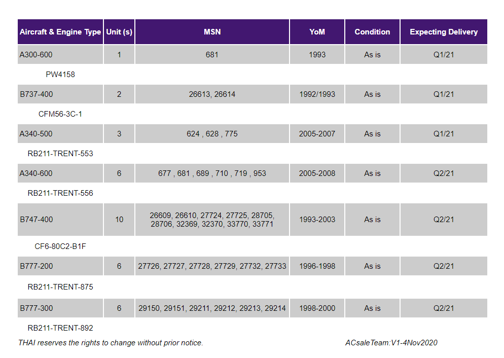 โดยระบุว่า เครื่องบินส่วนใหญ่มีอายุเฉลี่ยเกินกว่า 20 ปี (A340 มีอายุเฉลี่ย 12-15 ปี) อย่างไรก็ตาม ทั้งหมดยังสามารถใช้งานได้ และจะมีสัญญาขายที่ไม่มีประกันหลังการขาย (As is – Where is) ผู้ที่สนใจสามารถติดต่อขอข้อมูลเพิ่มเติม และ ยื่นความจำนงการเสนอราคาได้ที่อีเมลย์ aircraftsale@thaiairways.com ภายในวันที่ 13 พฤศจิกายน 2020 นี้