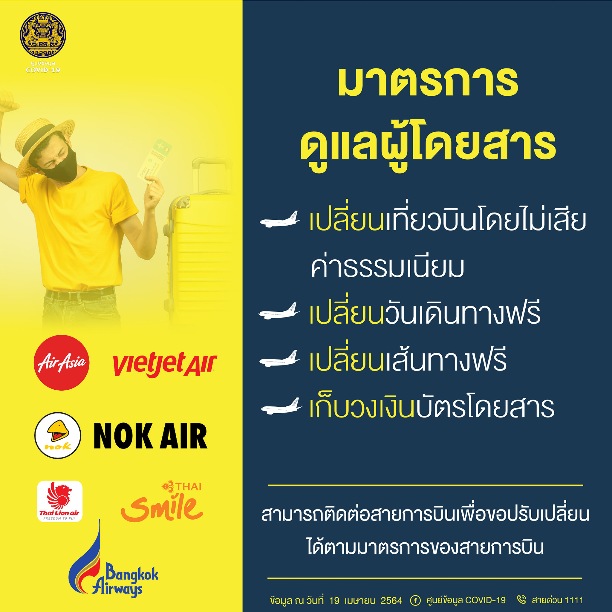 รับสถานการณ์โควิด! เช็คมาตรการดูแลผู้โดยสาร เปลี่ยนเที่ยวบินไม่เสียค่าธรรมเนียม เปลี่ยนวันเดินทางฟรี